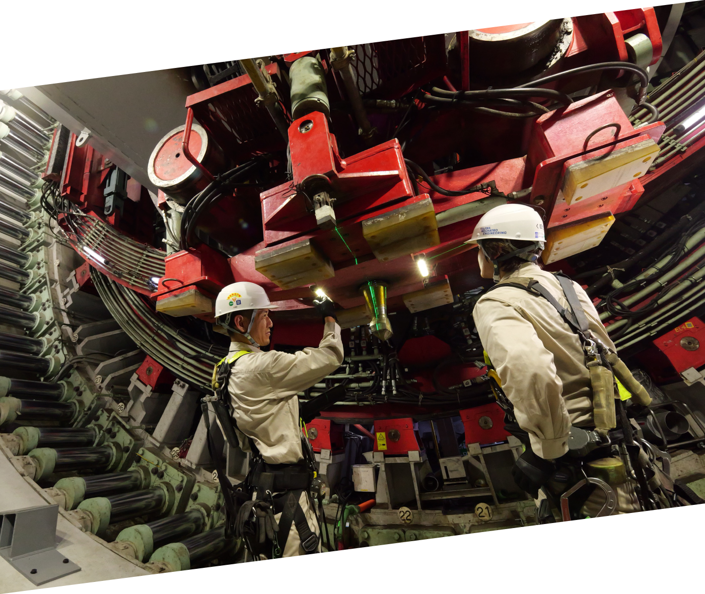 公田笠間トンネルでは、KME社員6名が現場に常駐しています。工事は昼夜二交代制(8:00~17:00/20:00~5:00)で進められており、土木担当の芳賀所長は計画・全体管理業務を、野村職員・久保田職員は機電担当として機械・仮設備計画や設置工事、メンテナンス等を鹿島JVと一体で行っています。工事の大半は建設機械による作業であり、トンネルを掘削する「シールドマシン」をはじめ、掘削した土砂を運ぶベルトコンベヤ、排水・給水設備など、機電の担当範囲は多岐にわたります。建設機械のトラブルが工事進捗に影響するため、いずれの業務においてもトラブルを発生させない対応がとても重要です。そのため、KMEチームはJV担当者とともにトンネル完成というゴールを目指す、“大切な仲間”として、日々の業務にあたっています。