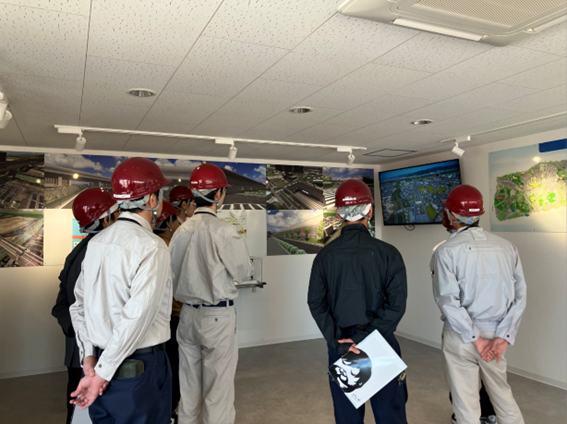 最終日は、新名神高速道路の枚方工事現場を訪問しました。この日は、新入社員だけ でなく、学生2名も参加しており、現場見学を通じて建設業の魅力や最新技術に触れていただきました。